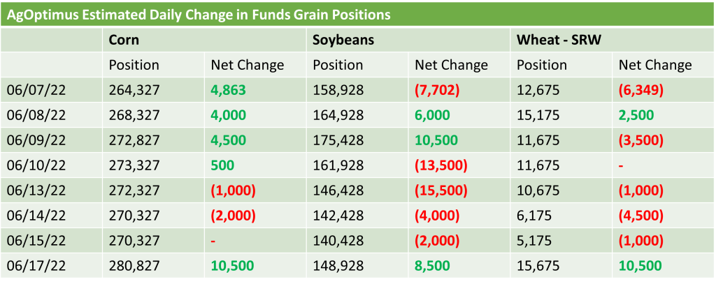 AgOptimus Estimated Daily Change in Funds Grain Positions – 6/17/22