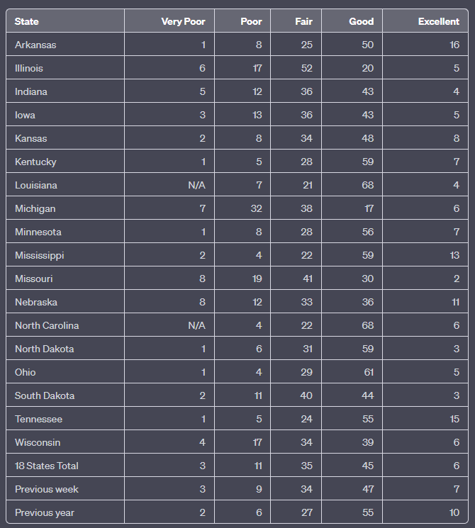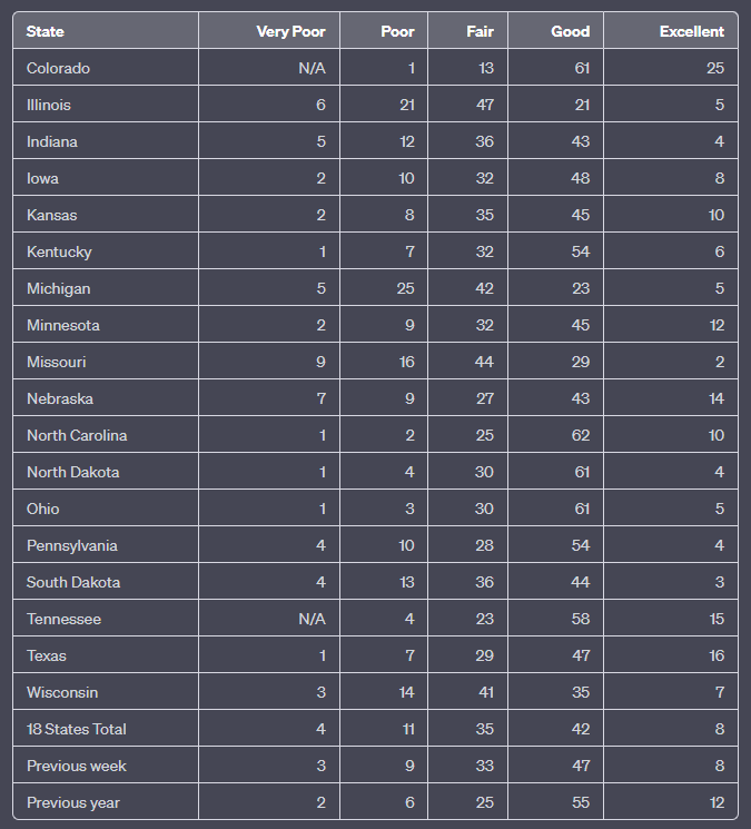 The information contained herein has been primarily derived from the USDA Crop Progress Report, available at the following URL: https://usda.library.cornell.edu/concern/publications/8336h188j To ensure the highest level of accuracy and comprehensiveness, we strongly encourage readers to directly refer to the original report.