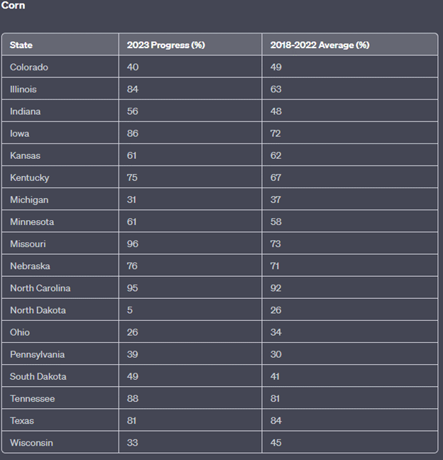 Corn planting seems to be progressing well, with a majority of states showing a faster planting progress compared to the 5-year average. Notably, Illinois and Iowa are significantly ahead of their averages, which is a positive sign as these two states are major corn producers.