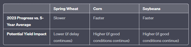While it’s difficult to make firm yield projections based on planting progress alone, the early planting of corn and soybeans could potentially lead to higher yields, assuming good growing conditions continue. Early planting generally allows for a longer growing season and potentially higher yields. However, the slower planting of spring wheat might potentially lead to lower yields, especially if the delay continues.