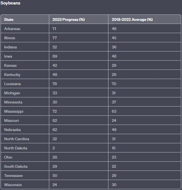 For soybeans, again, the majority of states are ahead of the 5-year average, with Illinois, Iowa, and Missouri showing particularly strong progress.
