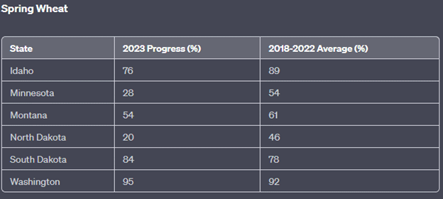 For spring wheat, with the exception of South Dakota and Washington, all states show a slower planting progress than the 5-year average. This might suggest a delay due to unfavorable weather conditions, such as cold temperatures or excessive rainfall, which could potentially delay the planting and germination of wheat.