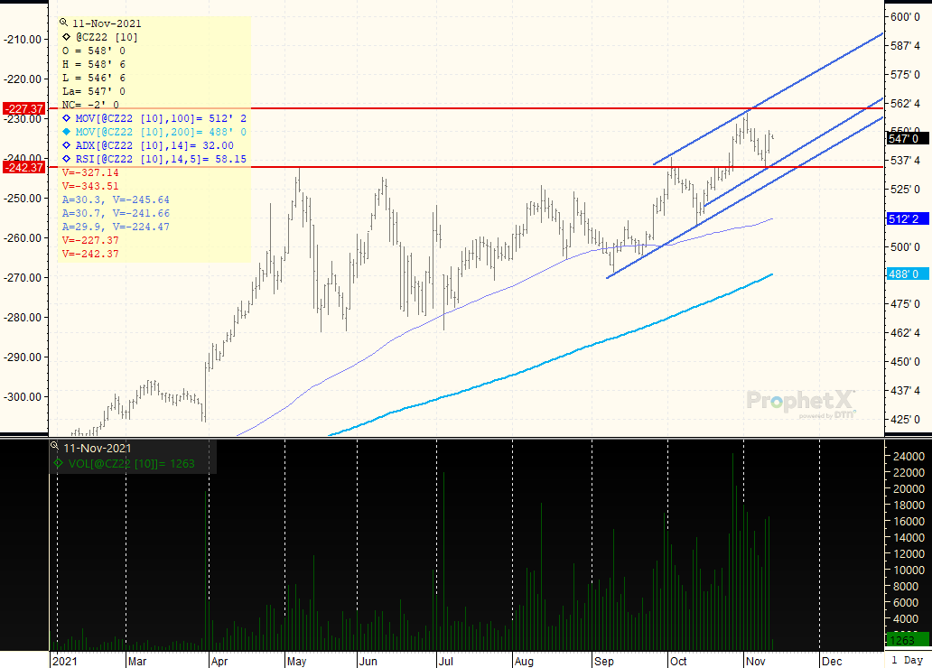 Corn: The EIA report for ethanol yesterday showed a 6% WOW slide in production, which would consume 5.5 bln bu of corn. Ethanol stocks were slightly higher to 852 mln glns. Ethanol margins remain very favorable, with more analysts believing ethanol demand could be 150-200 mln too low as margins remain profitable into Q1 2022. Exports remain tepid for both corn and beans, running well behind yr ago. China continues to purchase Ukraine corn, while US wheat loses out to the Black Sea. China’s Dalian corn prices continue to rise suggesting tight supplies, and a better potential to at some point buy US origin.