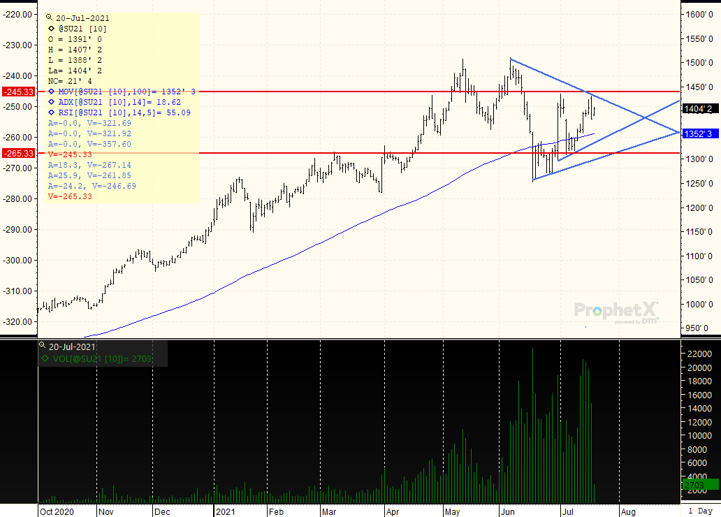 SEPTEMBER BEANS: The market may be in a trading range from $13.50 to $14.50, with peaks located at $14.30. However, in the big picture the pullbacks are repeatedly shallower which is allowing for the major trend to still remain sideways to higher. The 100 day moving average and trendline now cross at $13.50, offering strong support should we go there. However at this point think the weakness yesterday with the pullback to $13.81 probably marked a low, and the chart price direction could exit the triangle formed to the upside rather than downside. Look to continue to own breaks, as the chart is more positive than negative, though the ADX at 18 continues to point to a continuing struggle on rallies and breaks.