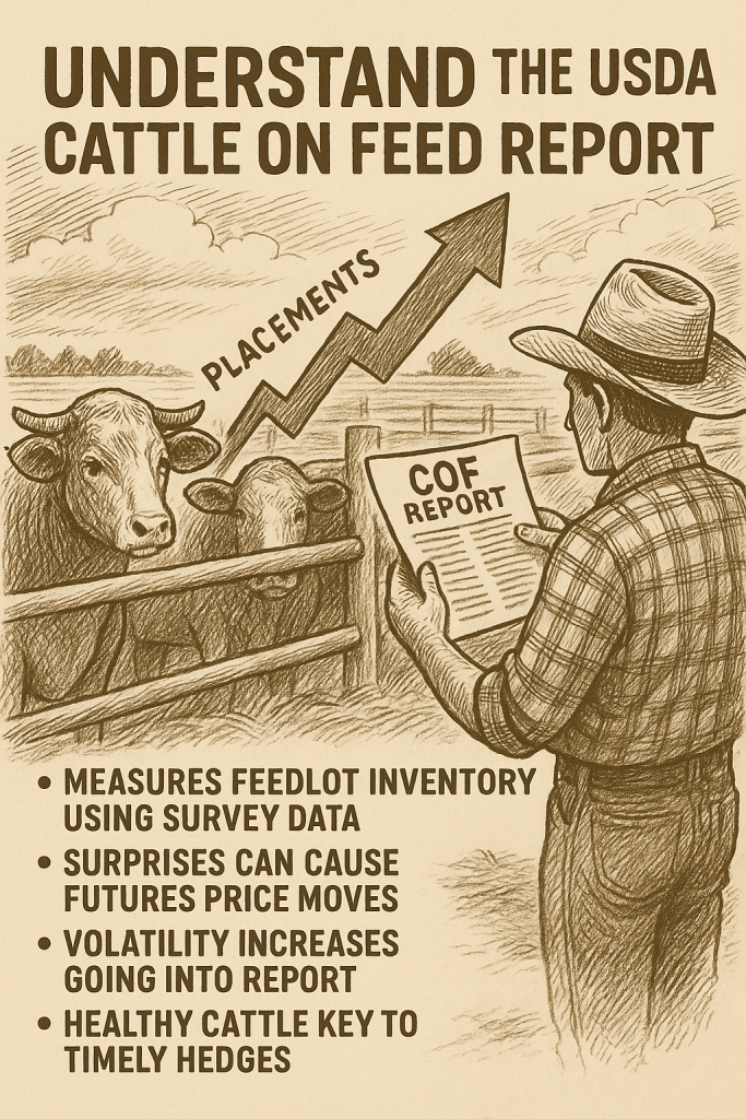 The USDA Cattle on Feed (COF) report drives cattle futures because it reveals real supply: placements, marketings, and on-feed inventory. What matters isn’t the number itself—but how it compares to pre-report estimates.