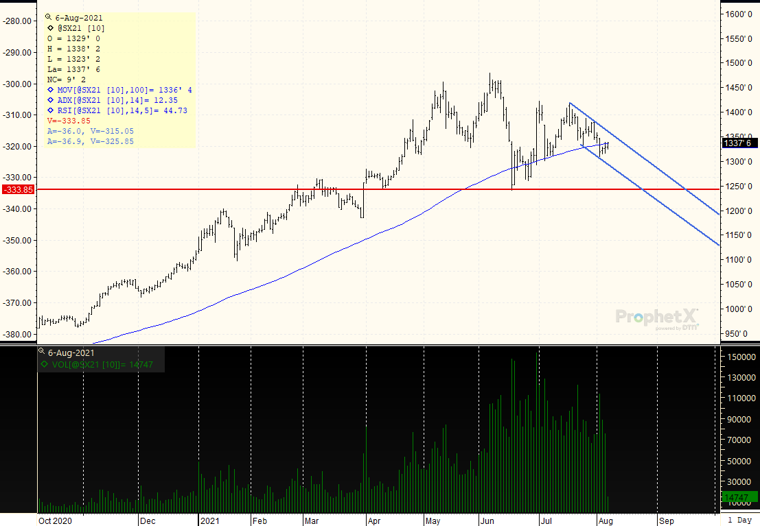 Tech talk: November bean prices trade in a sideways pattern, but it now appears as though $13.20/$13.25 will be a springboard for firmer trade past $13.50. Prices trade into the 100 day moving average of $13.35 which is positive, and top of the downtrend channel or key resistance is $13.45. No reason why prices cannot go there as the ability to congest and trade over strong moving averages speaks to strength, at least for today. December meal price action identifies the $350.00 level as value once again, challenging lows there but holding. The $348.00 to $350.00 area has been in place as a reliable bottom now since late June. Recovery this week verifies Dec. meal in a $350.00-$375.00 range. December soyoil prices test the 6055-6060c level and it holds for higher trade. Though prices tested trading range lows, price action is once again turning sideways keeping the 6050c to 66c range intact.