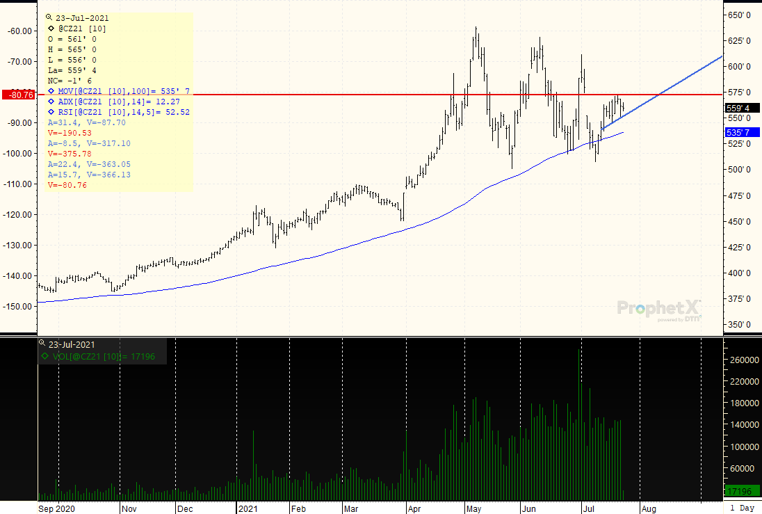 DECEMBER CORN: Compact trade in this market as major movement is sideways, but breaks are holding at higher levels than before. The gap-fill would be complete with trade to $5.73 1/2, and the ascending position of the market, outlined by the rising blue trendline, suggests that we may fully fill the gap in time. The trend ADX is extremely weak at 12, (anything under 25 is a weak trend), so would not expect a resumption of a higher trend until prices can close above $5.75. Think at the very least we will get there before we see more downside price action below $5.45.