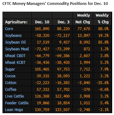 COT data attached, with managed money movement shown on the table below. Big fund buying in corn, pushing their net long up to 165k. The market pulled back at the end of the week, but with USDA showing us a declining carryout projection it’s possible the funds sit tight with their length going into the winter.