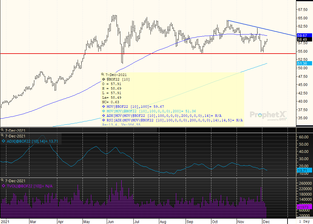 JANUARY SOYOIL: Big picture trade features continued recovery off the low of 55c. Trend continues higher as prices rise above 58c and head towards the 100 day moving average at 5950c. Would look for continued recovery though the ADX is weak at 13 signaling the resumption of a large sideways range. Still, there is good upside follow-through this AM, and major trendline resistance does not surface until we reach 6150c. With room to move, (no upside resistance), look for pullbacks to hold and for the lower end of the trading range to likely return to 57c vs. 55c on the break for a 57c-62c value range.